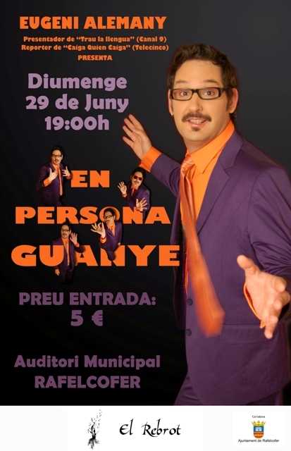 Després de l’èxit de “T’ho dic sense acritud”, l’humorista i presentador EUGENI ALEMANY arriba “EN PERSONA GUANYE”, un espectacle còmic amb el segell d’Eugeni: 100% valencià i 100% imprevisible.