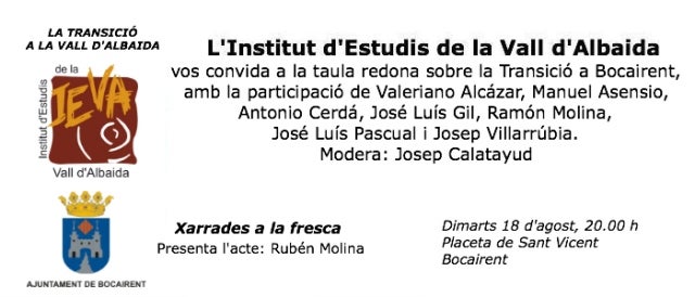 El pròxim dimarts 18 d’agost, dintre les Xarrades a la Fresca que organitza cada any l’Ajuntament de Bocairent a les 20.00 a la placeta de Sant Vicent, i amb el nom de “Taula de forces polítiques i sindicals”, tindrà lloc el primer dels actes previstos per a les Jornades Locals i Comarcals sobre la Transició a la Vall d’Albaida que hem organitzat des de l’Institut d’Estudis de la Vall d’Albaida.