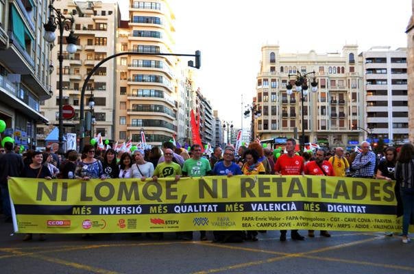 Més de 20.000 persones han clamat contra la llei Wert i les retallades en educació en les tres manifestacions desenvolupades a Alacant, València i Castelló, que han tingut lloc durant la vesprada del 9 de març. Aquesta assistència massiva se suma a l’èxit de la vaga educativa del matí amb un seguiment per part de l’alumnat de Secundària, ensenyaments no obligatoris i universitat que supera el 90%. Quant a les famílies i l’alumnat de Primària, el percentatge de participació s’ha situat al voltant del 70% i, en el cas del professorat d’ensenyament públic no universitari de tots els nivells, les xifres d’implicació es troben vora el 40%.