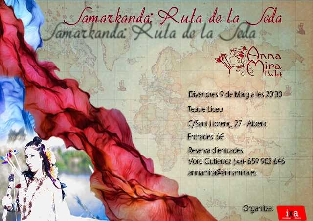 Samarkanda serà presentat al Teatre Liceu d’Alberic el divendres 9 de maig. L’acte està organitzat per IxA, i l’espectacle és a càrrec del Ballet d’Anna Mira, ballarina i professora de danses del món ( http://www.annamira.es) El guió i textos és d’Eli Llorens (escriptora valenciana, autora de El balneari dels àngels, recentment guardonada a Las Mujeres Cuentan, a més d’altres publicacions i premis). Les ballarines que formen part de Samarkanda són en la seua major part de pobles de la Ribera: Alberic, Alzira, Carcaixent, Castelló de la Ribera.