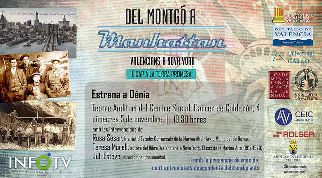 Uns 15.000 valencians van emigrar entre 1906 i 1920 al Canadà i els Estats Units, fugint de la misèria i dels abusos dels senyorets i per buscar allà el pa i el futur que ací no tenien. És una de moltes conclusions a què ha arribat la investigació exhaustiva feta per la productora InfoTV els últims dos anys i mig, dins del projecte Del Montgó a Manhattan. Valencians a Nova York, i que es vora reflectida en dos documentals que voran la llum a primers de novembre. Es tracta de Cap a la terra promesa i Adéu, Amèrica. L’any que ve n’arribaran dos més, per tancar la sèrie.