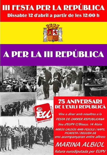 EU-Alzira celebrarà una festa el proper dissabte, 12 d’abril, en commemoració de la República i retrà homenatge al 75 aniversari de l’Exili republicà després de la guerra. Hi ha haurà parlaments, presentació de llibres, un dinar popular i música al carrer.