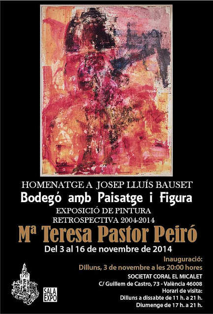 La Societat Coral el Micalet inaugura dilluns 3 de novembre, a les 20:00 hores, l’exposició ‘Homenatge a Josep Lluís Bauset. Bodegó amb paisatge i figura’, de l’artista plàstica Mª Teresa Pastor. Es tracta d’una quinzena de quadres d’estil variat, de molts formats, i on es nota molt la influència de l’impressionime, amb un gran domini de color.