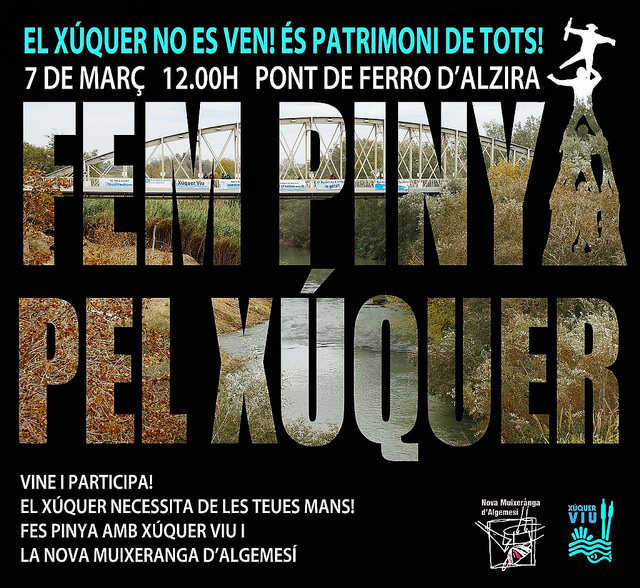 El dissabte 7 de març a les 12:00 hores tindrà lloc una Concentració al Pont de Ferro d’Alzira, convocada per Xúquer Viu i la Nova Muixeranga d’Algemesí reivindicat un Xúquer Viu com a element vertebrador de la comarca.