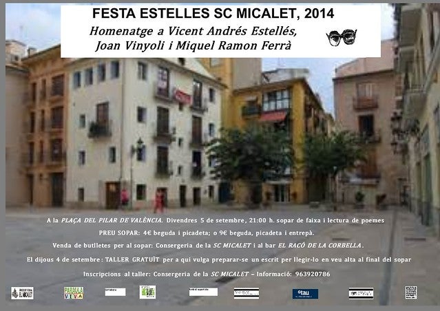 Dijous 4 de setembre: TALLER GRAUÏT DE LECTURA EN VEU ALTA. De 19:00 a 21:00 els nostres professors prepararan a qui s’inscriga un escrit d’un dels tres autors al que retrem homenatge per a llegir-lo al final del SOPAR ESTELLÉS. Inscripcions: Consergeria de la SC Micalet. C/ Guillem de Castro, 73. 46008 València.