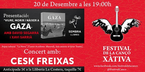 Els organitzadors enceten aquesta nova etapa amb esdeveniments que combinen diverses disciplines relacionades amb la paraula i la música, per això l’actuació de Cesk Freixas vindrà precedida de la presentació del llibre “Viure, morir i nàixer a Gaza” del fotoperiodista valencià David Segarra. “Viure, morir i nàixer a Gaza” és un projecte que sorgeix d’una tragèdia i d’un miracle. Un llibre amb una edició de qualitat on descobrir un centenar de fotografies sobre la gent, la vida, la bellesa i el dolor de la Franja de Gaza, acompanyades de poemes d’autors de la Mediterrània i textos del propi David Segarra. Editat per Sembra Libres, una editorial valenciana independent i cooperativa que estarà representada a l’acte amb la presència de Xavi Sarrià, escriptor, i compositor i cantant en l’extinta banda valenciana Obrint Pas.