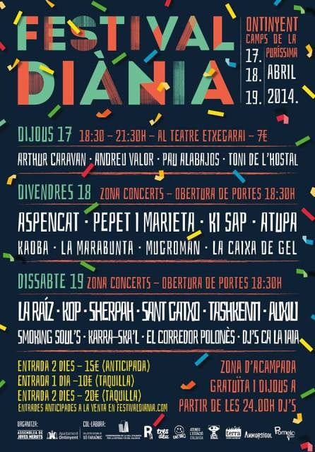 Els dies 17, 18 i 19 d’abril, Ontinyent, capital de la Vall d’Albaida, acollirà per primera vegada el Festival Diània. Un festival on 22 grups vinguts d’arreu del País Valencià i Catalunya ens faran un recorregut de tres dies de música on hi seran presents un gran ventall d’estils musicals. Amb un cartell format per Aspencat, La Raíz, Sant Gatxo,Auxili, Pepet i Marieta, Arthur Caravan, Pau Alabajos, Tashkenti, Sherpah…..entre molts altres.