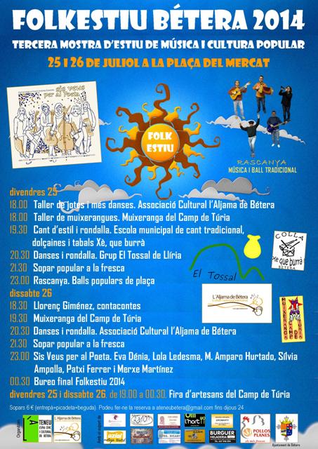 Divendres 25 i dissabte 26 de juliol arriba a la plaça del Mercat de Bétera el Folkestiu 2014, la tercera mostra d’estiu de música i cultura popular. Dos dies sense descans i amb una programació molt intensa de vesprada i de nit. Tots els espectacles són gratuïts; podeu reservar sopar, per un dia o pels dos, enviant un correu electrònic a ateneubetera@gmail.com, fins el dijous 24 (el preu del sopar és de 6 euros, entrepà, picadeta i beguda).