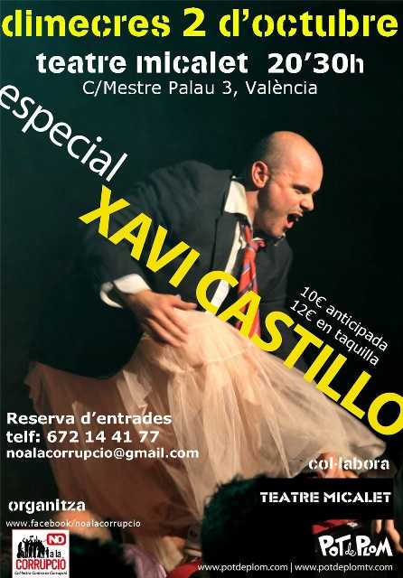 El pròxim dia 2 d’octubre el Col·lectiu Contra la Corrupció ha organitzat amb XAVI CASTILLO una FUNCIÓ ESPECIAL ANTICORRUPTIVA al Teatre Micalet a les 20’30h amb Rita, Cotino, el Rei i el nou estel mediàtic del moment… Annie Bottle i el seu “relaxing cup of cafe con leche”!!!