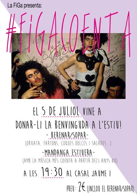 La Fira de Gandia Autogestionada ha organitzat la “FiGA Coenta”, una festa on la música més kitsch i divertida dels anys 80 i 90 serà la protagonista per a celebrar l’arribada de l’estiu. A més, per 2 euros hi haurà dret a un berenar/sopar amb orxata, fartons i les coques més tradicionals. La cita és aquest dissabte 5 de juliol a les 19.30 hores al primer pis del Casal Jaume I de Gandia, carrer Dona Teresa 2, i s’allargarà fins a la 1.00 hores de la matinada.