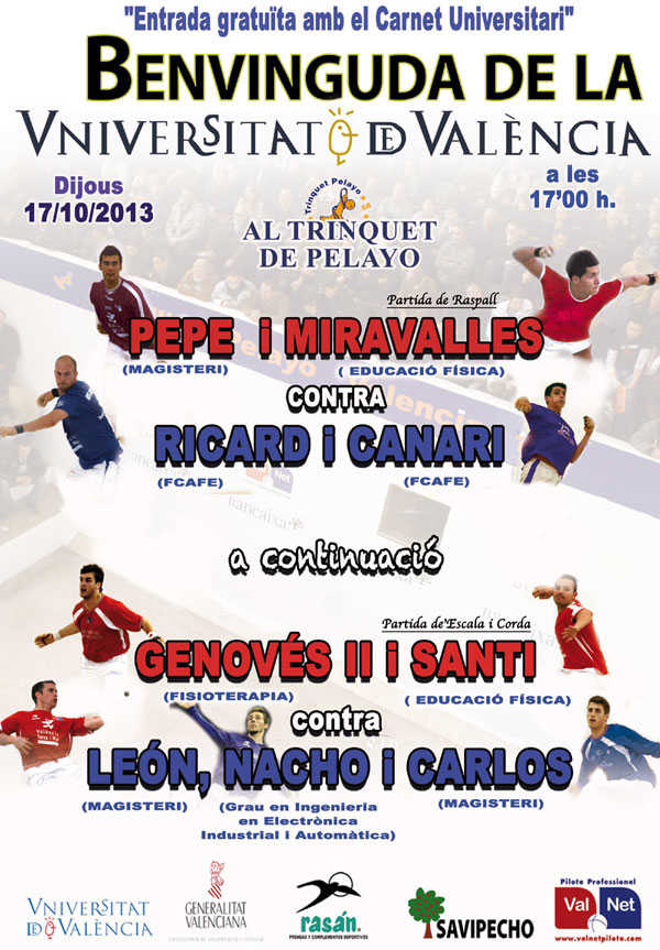 Aquest dijous dia 17 d’octubre, dins de les activitats de la Festa de Benvinguda de la Universitat de València, es disputaran al Trinquet de Pelayo, situat al carrer de Pelayo, de València, dues partides de pilota valenciana.
