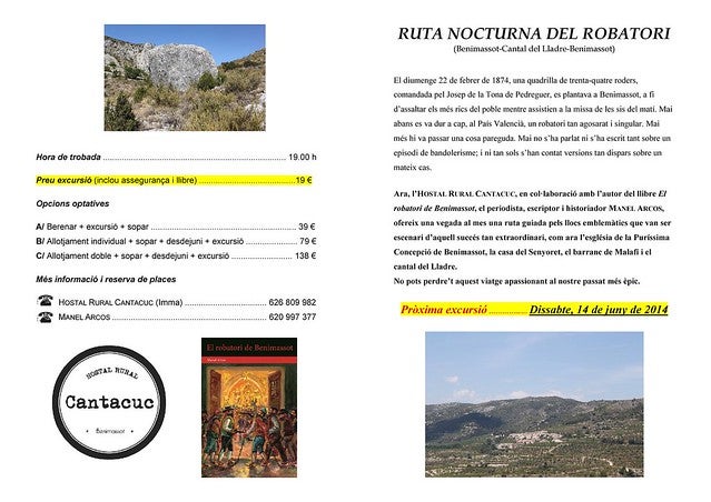 La primera part, la qual transcorrerà entre Benimassot i el cantal del Lladre, estarà reservada a esbrinar alguns dels misteris que van envoltar el robatori de la història del País Valencià.