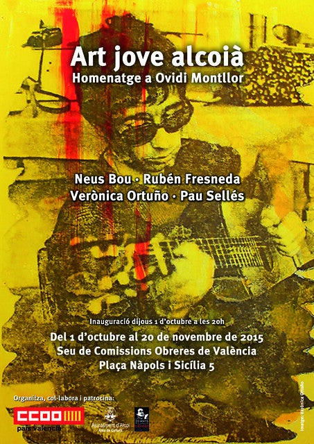 Rubén Fresneda, en nom dels artistes de la mostra Art jove alcoià. Homenatge a Ovidi Montllor es complau de convidar-vos a la inauguració d’aquesta exposició el proper dia 1 d’octubre a les 20h a la seu de Comissions Obreres del País València, plaça Nàpols i Sicília 5, València.