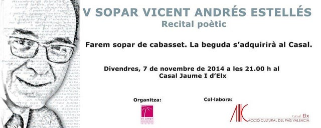 El Tempir i el Casal Jaume I d’Elx, s’afegeixen a l’homenatge que des de diverses poblacions valencians es realitza al poeta valencià més estimat i destacat del segle XX, Vicent Andrés Estellés. Per això, enguany, per tal que hi haja la màxima afluència de persones al recital poètic, farem sopar de cabasset però la beguda es comprarà al Casal. Les persones que hi estiguen interessades a assistir a la vetlada poètica, cal que confirmen assistència telefonant al 644 023 493 (telèfon d’atenció d’El Tempir) o al