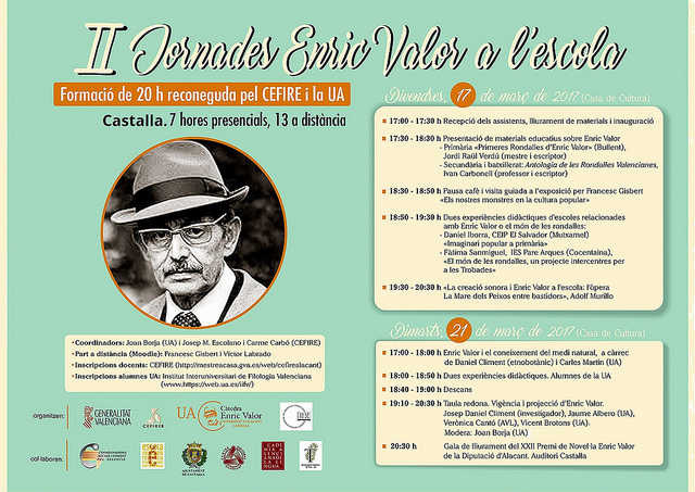 La Coordinadora pel Valencià de l’Alcoià i el Comtat, la Universitat d’Alacant (Càtedra Enric Valor) i el Centre de Formació de Professors organiten les II Jornades Formatives Enric Valor a l’escola. Es tracta d’unes jornades reconegudes amb 20 hores: 7 hores presencials,