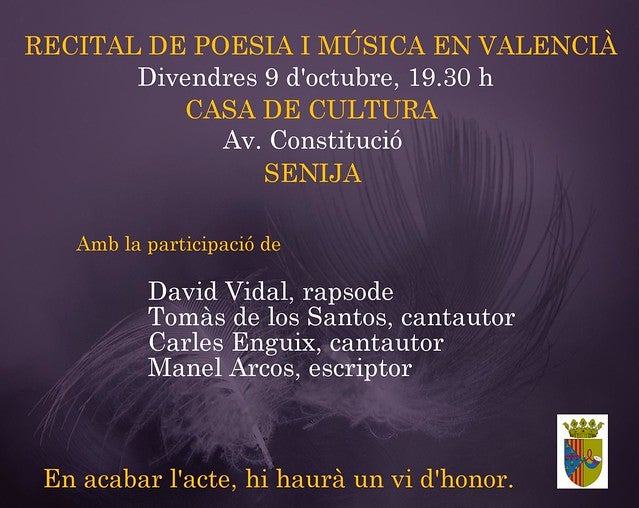 Divendres 9 d’octubre, a les 19.30 hores, se celebrarà el II Recital de Poesia i Música en Valencià a la Casa de Cultura de Senija.