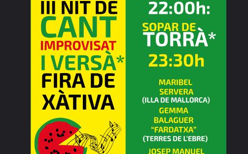 Per tercer any consecutiu se celebra a Xàtiva la III Nit del Cant improvisat i versà, amb la intenció de recuperar aquest cant popular de La Costera. Aquest any comptarà amb els cantaors Josep Manuel Chafer “El Gallo”, Hilari Alonso i rondalla, Gemma Balaguer “Fardaxa” (Terres de l’Ebre), Maribel Servera (Illa de Mallorca) i Laia Pedrol (Sabadell) que seguirà amb versà lliure on el públic n’és el protagonista.