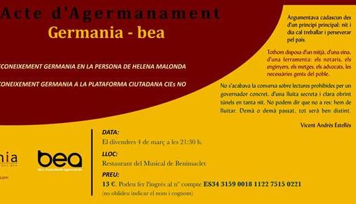 Una vegada més us volem convidar a participar en el sopar Germania, que se celebrarà el 4 de març, a les 21.30, al Musical de Benimaclet. A més, enguany l’entrega de premis comptarà amb una novetat: un reconeixement grupal per a algun col·lectiu valencià el treball del qual volem destacar per ajudar a aconseguir una societat més justa i igualitària, la que sempre hem defensat des del BEA. Així, voldríem que aquest es mantinga també en el temps, tot apropant el sindicat d’estudiants a aquells conjunts de persones que treballen en la mateixa direcció que ho hem fet i ho fem nosaltres.