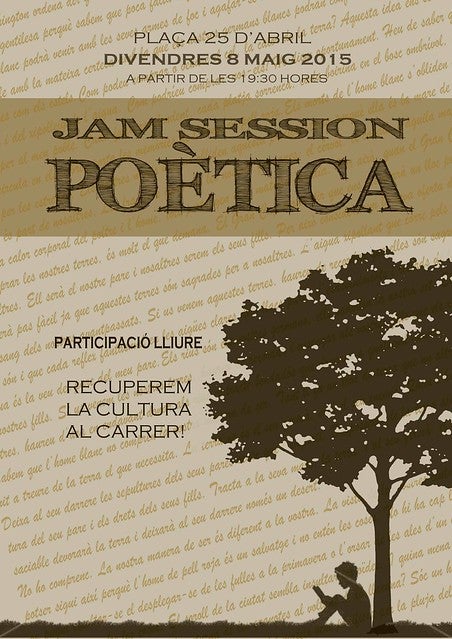 El pròxim divendres 8 de maig a partir de les 19:30 hores, sota el lema Recuperem la cultura al carrer, a la Plaça 25 d’Abril s’ha impulsat una lectura poètica lliure a l’estil jam session, és a dir, participació lliure amb lectura de qualsevol poema inclús improvisant o recitant poesia pròpia.