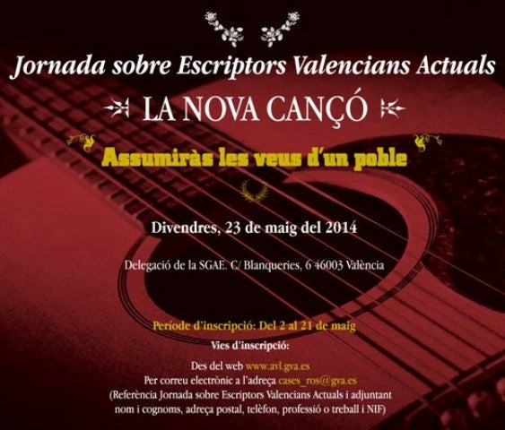 Crec, sincerament, que ens trobem en un moment on la Nova Cançó, on el seu esperit no ha deixat d’existir, pot significar un autèntic cant a l’esperança, l’esperança d’un millor futur, cosa que ens convé en un moment històric on el desencís i la desconfiança ens envolten amb molta freqüència. Pas a pas. Josep Lluís Doménech Zornoza El Punt/Avui 19/05/14 Els cantautors i grups musicals i literaris valencians de la Nova Cançó centraran les ponències i les taules redones de la Jornada sobre Escriptors Valencians Actuals, que ha organitzat l’Acadèmia Valenciana de la Llengua per al pròxim divendres, dia 23 de maig, en la seu de la Societat General d’Autors a València. La proposta de la Jornada del 2014 organitzada per l’Acadèmia Valenciana de la Llengua, se centra enguany en un autor col·lectiu, és a dir, els cantautors i grups musicals i literaris valencians de la Nova Cançó, tenint en compte els gèneres populars i els cultes mestratges musicals i literaris valencians en el context europeu de les darreres quatre dècades del segle xx. S La Jornada proposada per l’AVL, oberta a professionals, estudiosos, estudiants, i amants de la música i la literatura, provarà de combinar l’atenció a figures màximes, com Raimon, el traspassat Ovidi Montllor o el grup Al Tall, i als protagonistes participants, i l’anàlisi i el testimoni general de tendències i realitzacions de la Nova Cançó, manifestació literària i musical de màxima influència i projecció social, lingüística i cultural de la societat valenciana contemporània.