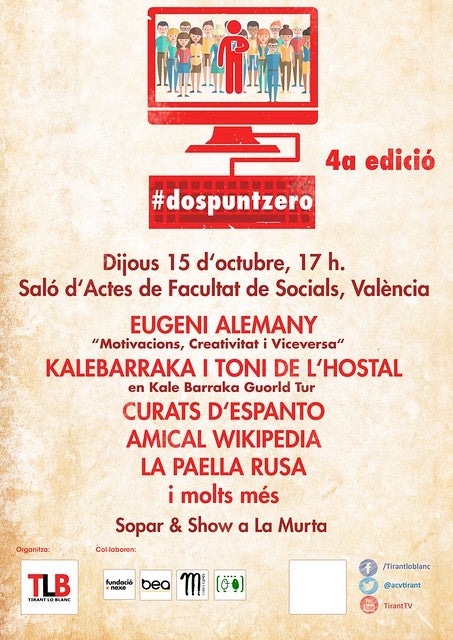 L’Associació Cívica Valenciana Tirant lo Blanc i la Fundació Nexe, amb el suport del Bloc d’Estudiants Agermanats, organitzen la quarta edició de la jornada #dospuntzero, un encontre entre valencianisme i xarxes socials que enguany porta el títol de “Filosofies Online”. Amb voluntat de reconéixer el protagonisme de les xarxes socials en la difusió del valencianisme i altres valors, el programa compta amb perfils de renom de l’actualitat a la xarxa, que exposaran, cadascú amb el seu propi estil, la seua visió particular del món i explicaran en viu i en directe com fan i desfan des de les seues pantalles.
