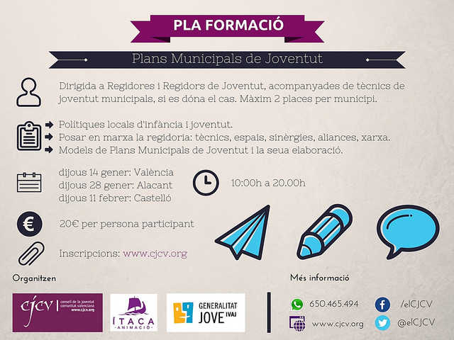 Aquesta formació, que compta amb el suport de l’IVAJ.Generalitat Jove, començarà al mes de gener de 2016. Els i les interessades poden informar-se i inscriure’s a través de la página web del CJCV www.cjcv.org .