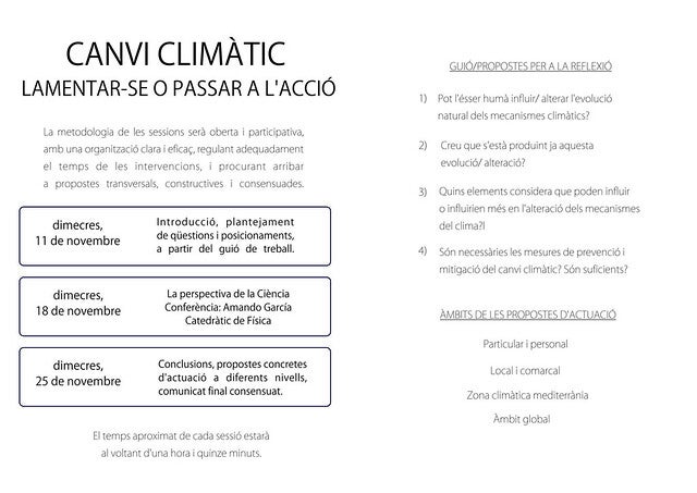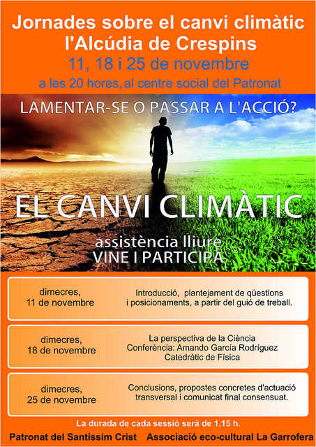 Arran de la preocupació conjunta del Patronat del Santíssim Crist i de l’associació cultural La Garrofera, de l’Alcúdia de Crespins, ens hem decidit a organitzar aquestes jornades sobre el Canvi Climàtic, amb la intenció d’oferir un espai d’expressió de la preocupació que existeix al carrer sobre aquest tema, de plantejament de dubtes i opinions, d’oferir respostes des de la ciència, de sensibilització, i de valoració de la importància d’encetar actuacions concretes des dels diferents nivells de responsabilitat. Així mateix, ens agradaria, amb la participació de tots, que fórem capaços de generar un manifest final consensuat amb propostes concretes que es faria arribar a tots els implicats per engegar iniciatives i accions que considerem necessàries en els àmbits plantejats.