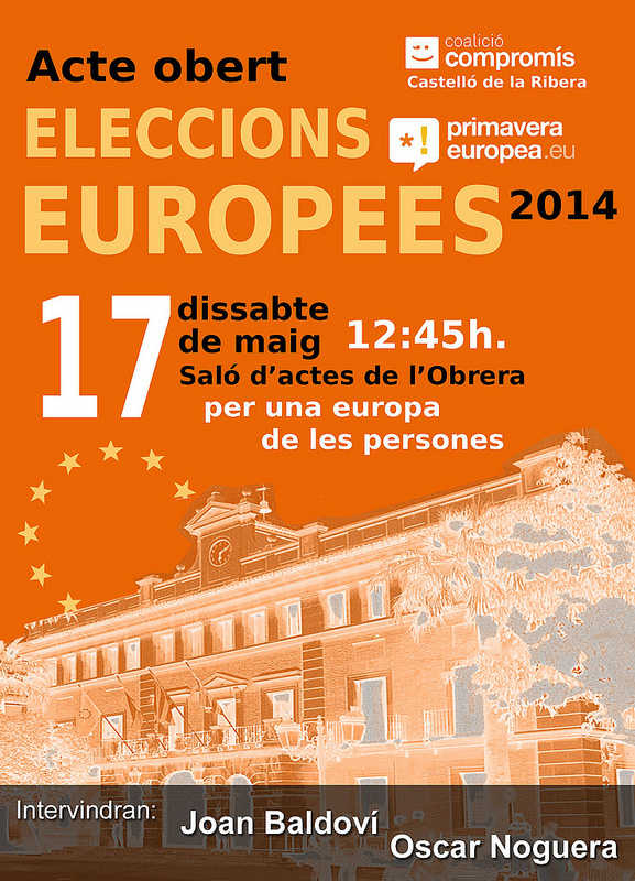 El proper dissabte 17 de maig, a les 12:45 del matí al Saló d’actes de l’Obrera de Castelló de la Ribera, Joan Baldovi (diputat al Congres) i Oscar Noguera (porteu del Grup Municipal GCiE-Compromís) faran un acte comarcal de campanya per a les eleccions europees del 25 de maig, també ens acompanyaran Albert Furio i Reis Gallego.