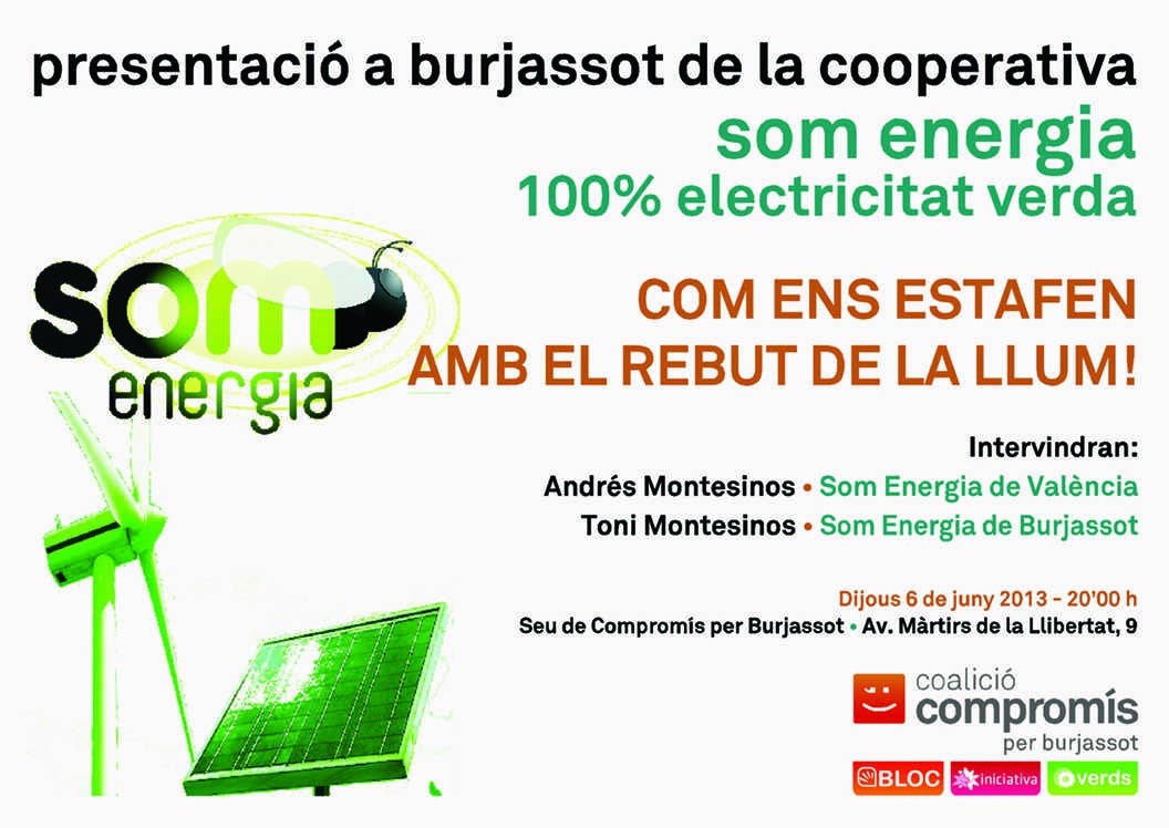 El proper dijous 6 de juny a les 20 hores a la seu de Compromís per Burjassot, a l’Avinguda Màrtirs de la Llibertat 9, es farà la presentació pública de la cooperativa d’energia verda, Som Energia. A l’acte participaran Andrés Montesinos de Som Energia de València i Toni Montesinos de Som Energia de Burjassot.