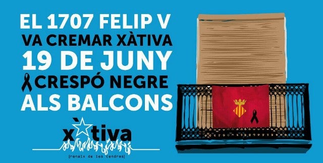 Per a dijous, 19 de juny, el col·lectiu cívic Xàtiva Renaix ha promogut una campanya simbòlica de col·locació de banderes de la ciutat amb crespons negres als balcons per recordar la crema de Xàtiva per part de Felip V. El tancament dels actes reivindicatius es farà a les 20:00 hores en la pedra dels maulets on es durà a terme una concentració per exigir un procés constituent encaminat a dissenyar un nou futur entre tots i totes. Per tot açò, des del col·lectiu d’Esquerra Unida Xàtiva fem una crida per recolzar i secundar tots els actes convocats perquè el record de la crema de la ciutat es transforme en coratge per iniciar un nou moment històric d’aprofundiment democràtic.