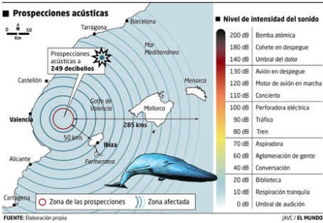 La fauna marina del Mediterrani occidental, en plena costa dels Països Catalans viurà una experiència propera a la fi del món . Segons publica el diari El Mundo, els canons submarins que s’empraran per als sondejos emetran cada deu segons ones sonores a 249 decibels , molt per sobre del llindar del dolor , situat en els 180 decibels , i devastarà la pesca durant mesos al golf de València , amenaçarà l’hàbitat de milers d’aus i alterarà les rutes migratòries de cetacis , dofins i tortugues amb uns efectes secundaris que inclouen dolor extrem , hemorràgies internes i danys auditius irreversibles .