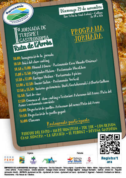 10.00: Inauguració de la fira per part de Manuel Espinar, president de la Federació d’Hostaleria de València; Pilar Moncho diputada de turisme; Jordi Major, alcalde de Cullera; Jordi Vicedo president de la Mancomunitat de la Ribera Baixa i Txema Peláez president de la Mancomunitat de la Ribera Alta.