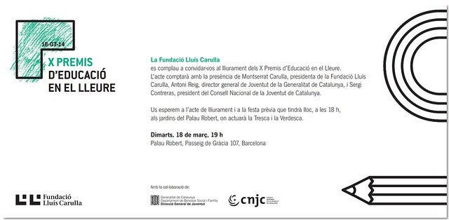 L’acte de lliurament dels premis tindrà lloc dimarts vinent, 18 de març, a les 19 h, a la sala Cotxeres del Palau Robert (Passeig de Gràcia, 107, Barcelona). Hi intervindran Montserrat Carulla, presidenta de la Fundació Lluís Carulla, Antoni Reig, director general de Joventut del departament de Benestar i Família de la Generalitat de Catalunya, i Sergi Contreras, president del Consell Nacional de la Joventut de Catalunya. També ho faran Marc Corominas, del Grup de Colònies a Borredà, en nom de les entitats guanyadores, i Josep González-Agàpito, que raonarà els mèrits dels guardonats.