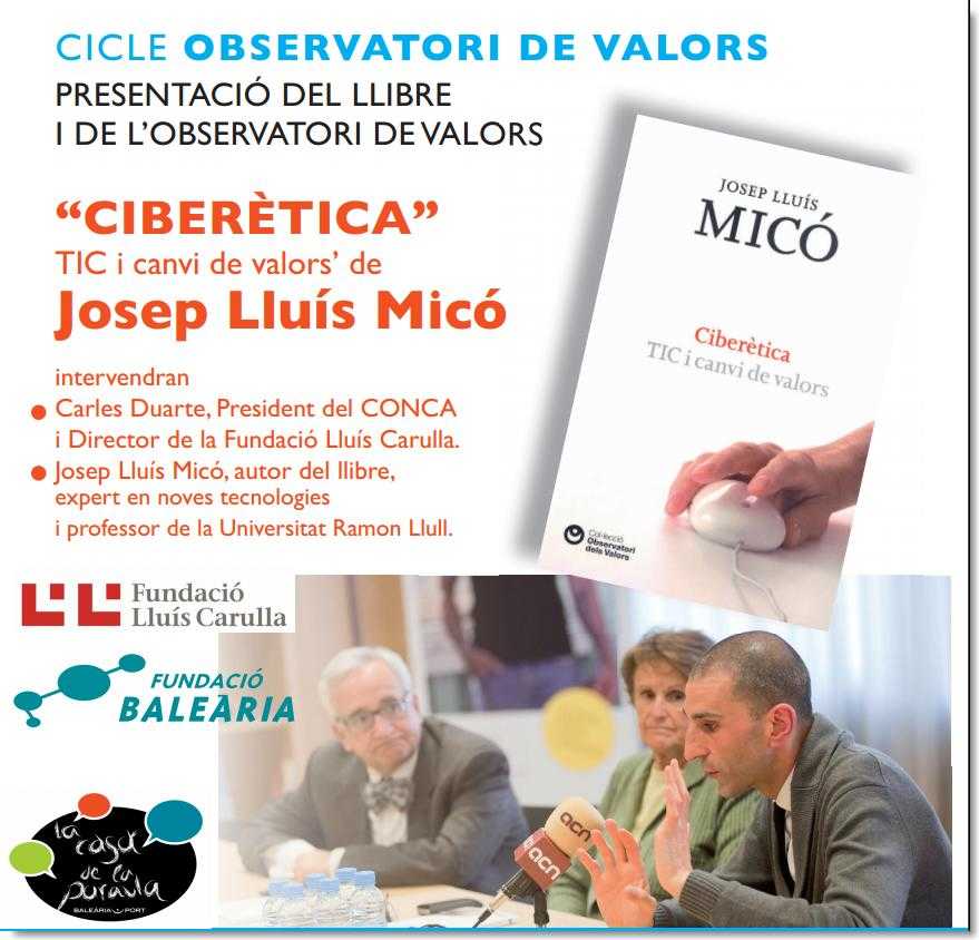 La presentació de l’Observatori dels Valors i del llibre Ciberètica. TIC i canvi de valors es farà el divendres dia 9 de maig, a les 20.30 hores, a la Casa de la Paraula (Estació Marítima, s/n, de Dénia), de la Fundació Baleària. En el transcurs de l’acte parlaran Carles Duarte, director de la Fundació Lluís Carulla, i l’autor del llibre, Josep Lluís Micó .