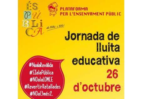 Perquè l’escola que volem és un espai de convivència i igualtat d’oportunitats i de drets, hem decidit sumar-se a la jornada de lluita educativa que tindrà lloc el proper 26 d’octubre a nivell estatal i que convoca la Plataforma per l’Escola pública de la que formen part sindicats, FAPA i Escola Valenciana entre altres. Aquesta jornada de lluita inclou la convocatòria de vaga per part de pares i mares, i estudiants, i tot tipus d’accions reivindicatives per part del professorat.