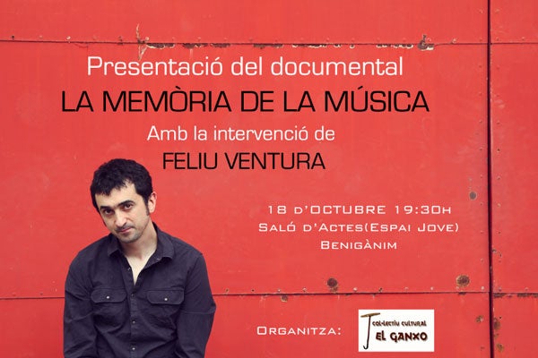 Aquest divendres 18 d’Octubre es presenta del documental realitzat per Feliu Ventura,“La memòria de la música”. Serà al Saló d’Actes de l’Espai Jove a partir de les 19:30h, amb la intervenció del mateix Feliu Ventura.