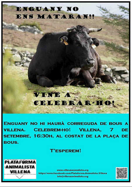 Com ja tothom sap, la correguda de bous d’aquest any no es realitzarà. Independentment del motiu, l’important és que sis animals, innocents i espantats, més els cavalls utilitzats, no seran torturats lentament fins a la mort per al gaudi d’uns pocs. I només per això ja HI HA RAONS SUFICIENTS PER CELEBRAR.