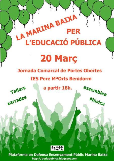 La Plataforma PROU donem el nostre suport absolut als companys i companyes de la Marina Baixa que demà dijous 20 de març faran més visible si cap la lluita per la defensa d’una educació pública, de qualitat i per a tots i totes.