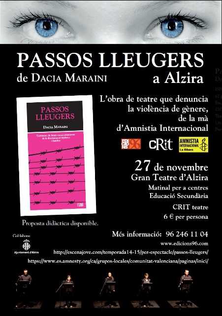 Al voltant de la la data commemorativa del 25 de novembre Dia Internacional Contra la Violència cap a les Dones, el dia 27 de novembre, al Gran Teatre d’Alzira, cedit pel seu Ajuntament, en sessió matinal es representarà Passos lleugers per a alumnat del segon cicle d’ESO i de Batxillerat. Per ara, ja hi ha tres centres que acudiran a aquest esdeveniment teatral: l’IES Rei en Jaume d’Alzira, l’ IES Arabista Ribera de Carcaixent i l’IES Pere Esplugues de La Pobla Llarga.