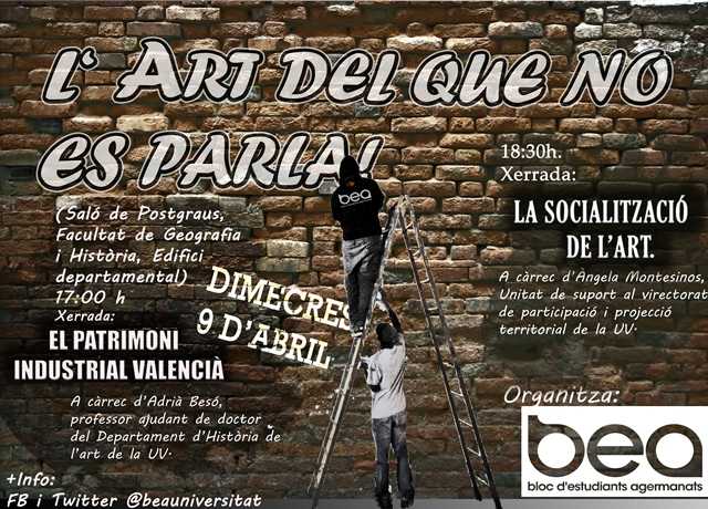 El pròxim dimecres 9 d’abril del 2014, el Bloc d’estudiants Agermanats ha organitzat unes interessants xarrades d’història de l’art a la Facultat de Geografia i Història, concretament al saló de Postgrau de l’edifici departamental on estan els departaments d’història de l’art i de Prehistòria i arqueologia. Aquestes seran dues xarrades una primerament a les 17:00 h de “Patrimoni industrial valencià” a càrrec d’Adrià Besó Ros, professor ajudant de doctor del departament d’Història de l’art a la Universitat de València. I altra a les 18:30 h de “La socialització de l’art” a càrrec d’Àngela Montesinos de la Unitat de suport al vicerectorat de participació i projecció territorial de la Universitat de València, i organitzadora de Ciutat Vella oberta.