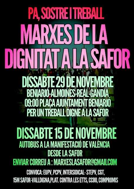 Membres de diferents moviments socials com la PAH, el 15M Safor Valldigna o la Plataforma Contra les ETTS; de partits polítics com EUPV i Compromís; i sindicalistes de CGT i CCOO, van començar la marxa a les 09:00 a Beniarjó i va finalitzar a Gandia a les 13:00.
