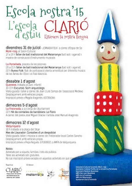 Amb el títol “ESCOLA NOSTRA”, l’associació de pares del Matarranya “Clarió” organitza la seua 1a Escola d’Estiu dedicada al foment de la llengua i al coneixement del patrimoni de la comarca. Des de danses i música tradicional fins a contalles de bandolers, passant per explorar com els arqueòlegs o visitar l’únic poble deshabitat de la comarca: el Mas de LLaurador. Tot amb activitats divertides i a càrrec d’especialistes locals o vinculats al territori.