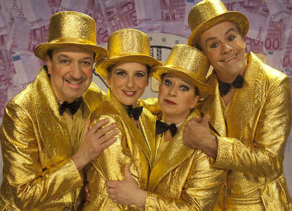 La porta s’obri i una glopada de llum daurada i tensa ix de l’interior. La música va ‘in crescendo’ i apareixen de l’interior de la caixa forta els banquers i les banqueres, ricament vestits, completament daurats, des del barret de copalta fins els cordons de las sabates i portant a la mà un maletí daurat i ple de….