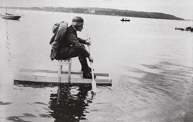 I de sobte heus-lo ací, vestit de soldat, entre les bales de l’enemic i les de l’escamot d’afusellament, sobre aquesta espècie d’embarcació, tan ridícula com precària, surant en una inestable massa d’aigua, la seua particular llacuna Estígia, que està disposada a engolir-se’l en un tres i no res si arriba a perdre l’equilibri. A ell, a la seua pesada motxilla i a l’insofrible casc que suposadament protegeix el seu cap i en què es cou el seu intel·lecte turmentat. Per això està tan concentrat. Està filosofant entre les boires de la por.