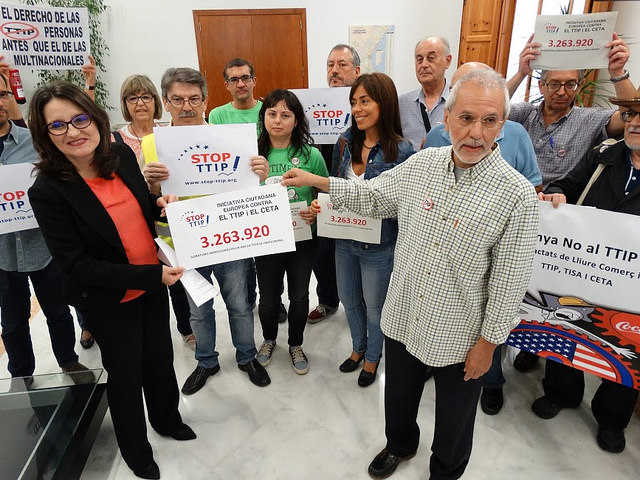 Ahir, 8 d’octubre, al Palau dels Català de Valeriola es va fer el lliurament a la Vicepresidenta del Consell, Mònica Oltra, de les signatures arreplegades en els països de la Unió Europea en el marc d’una Iniciativa Ciutadana Europea (semblant a una ILP d’àmbit europeu) per demanar un pronunciament de les institucions de la Unió en contra del Transatlantic Trade and Investment Partnership (TTIP).