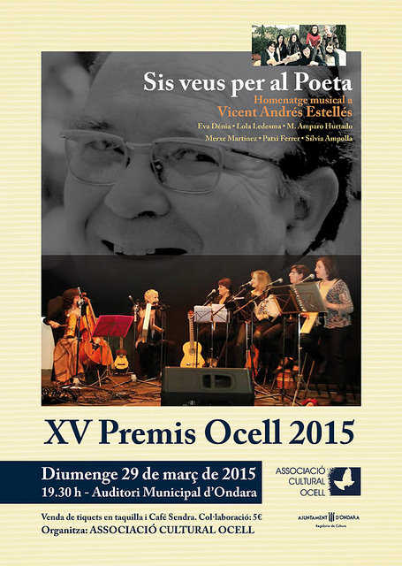 El proper diumenge 29 de març a les 19.30 hores tindrà lloc a l’Auditori d’Ondara el lliurament dels Premis Ocell corresponents a l’exercici de 2015. Una gala on coneixerem els guardonats local i comarcal que els membres de l’Associació Cultural Ocell han votat un any més de manera lliure i individual. A més, pel que fa a l’espectacle escollit per a l’edició d’enguany, després del lliurament s’estrenarà a l’escenari ondarenc el muntatge poètico-musical Sis veus per al Poeta. Homenatge musical a Vicent Andrés Estellés: un recomanable recorregut per l’herència literària estellesiana dut a terme en clau femenina. I és que les encarregades de donar vida a aquesta antologia són Eva Dénia, Lola Ledesma, Mª Amparo Hurtado, Merxe Martínez, Patxi Ferrer i Sílvia Ampolla: grans intèrprets que aporten una visió inèdita i apassionant de l’univers del poeta de Burjassot.