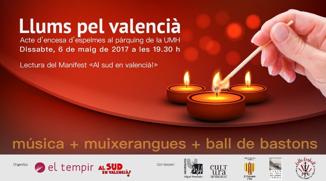 El Tempir ha convocat totes les persones (tant si són de fora d’Elx com de la mateixa ciutat) a participar en una encesa d’espelmes que reivindicarà la necessitat de replantar i revitalitzar el valencià al sud. L’acte tindrà lloc al pàrquing de l’edifici la Gàlia de la UMH aquest dissabte a partir de les 19.30 hores. L’encesa tindrà una doble vessant, la reivindicativa amb la lectura d’un manifest a favor del valencià al sud i la lúdica amb música, muixerangues i exhibició del ball de bastons. A l’acte participaran la Colla Corball de cultura popular de l’Alacantí, la Colla de dolçainers i tabaleters El Cascabot d’Elx i la Colla El Cocó de dolçaines i tabals d’Alacant, i amb el suport de la UMH d’Elx.