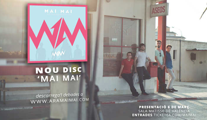La nova banda de rock valenciana Mai Mai, la qual va llançar primer single i videoclip Filibusters fa dues setmanes, publica nou EP. Música elaborada, rock obert a estils germans, on cada lletra simbolitza una sensació diferent: amor, passió, realitat social…En el llançament destaca el fet que tot el treball ha estat autoproduït pels mateixos membres del grup, els quals s’han encarregat dels vídeos promocionals, videoclip, disseny web i tots els elements que conformen el llançament la banda.