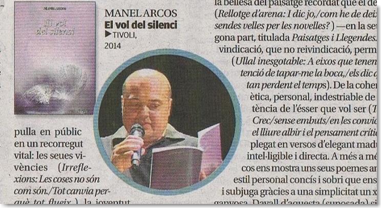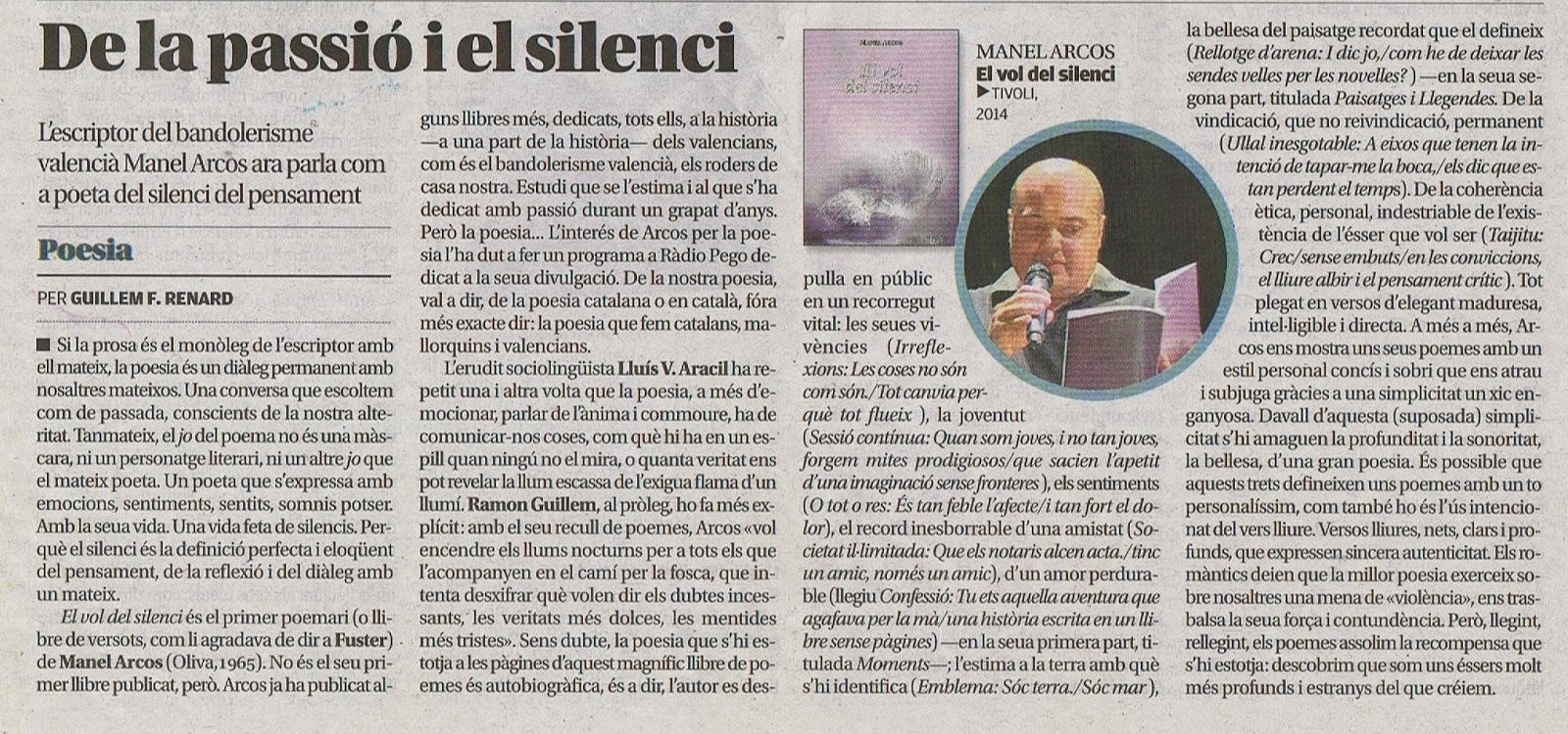 Aquest és el títol de la ressenya que el crític literari Guillem F. Renard va escriure sobre el recull de poemes El vol del silenci (Manel Arcos, Tívoli, 2014) en el Posdata, suplement cultural del diari Levante-EMV, del 4 de juliol de 2014 (núm. 859, p. 4). Renard diu al principi de l’article que “el silenci és la definició perfecta i eloqüent del pensament, de la reflexió i del diàleg amb un mateix”. Si voleu accedir al contingut de l’article i inclús guardar-vos-el, heu de prémer sobre la imatge següent (per a veure-la ampliada, primerament heu de clicar el botó esquerre del ratolí -Firefox- i triar l’opció ‘Visualitza la imatge’ o el botó dret -Internet Explorer- i elegir l’opció ‘Obrir vincle’).