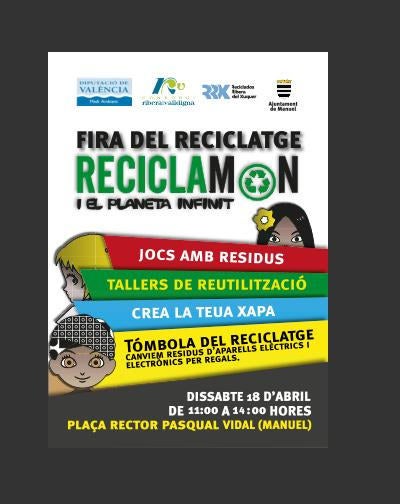 Demà, dissabte 18 d’abril, la Plaça Rector Pascual Vidal de Manuel, d’11h a 14h, acull una Fira del Reciclatge, dins de la campanya Reciclamon i el Planeta Infinit, promoguda pel Consorci Ribera i Valldigna i la Diputació Provincial de València, amb diferents activitats educatives i lúdiques per a conscienciar sobre els residus i la importància del reciclatge per al medi ambient.